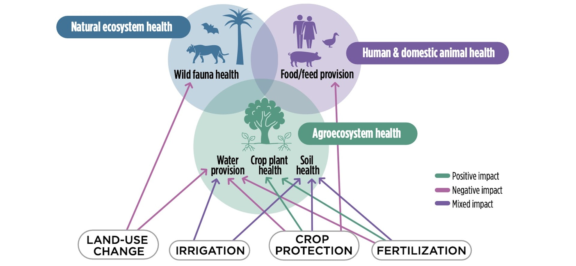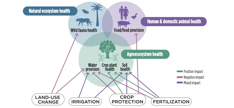 Diagrama conceptual de One Health Atlas que ilustra las interacciones entre los agroecosistemas de salud de los cultivos, los ecosistemas naturales y la salud humana y animal.